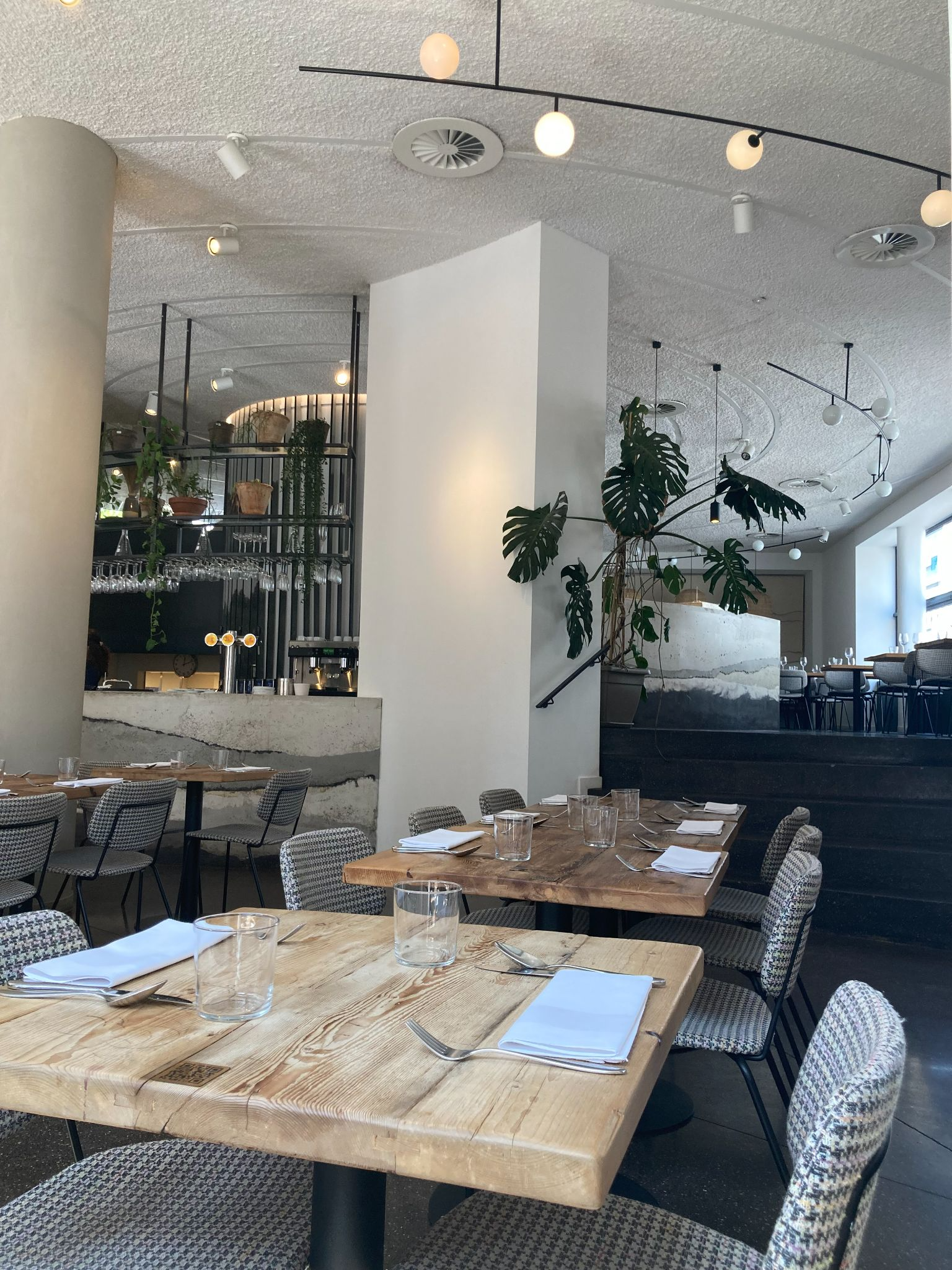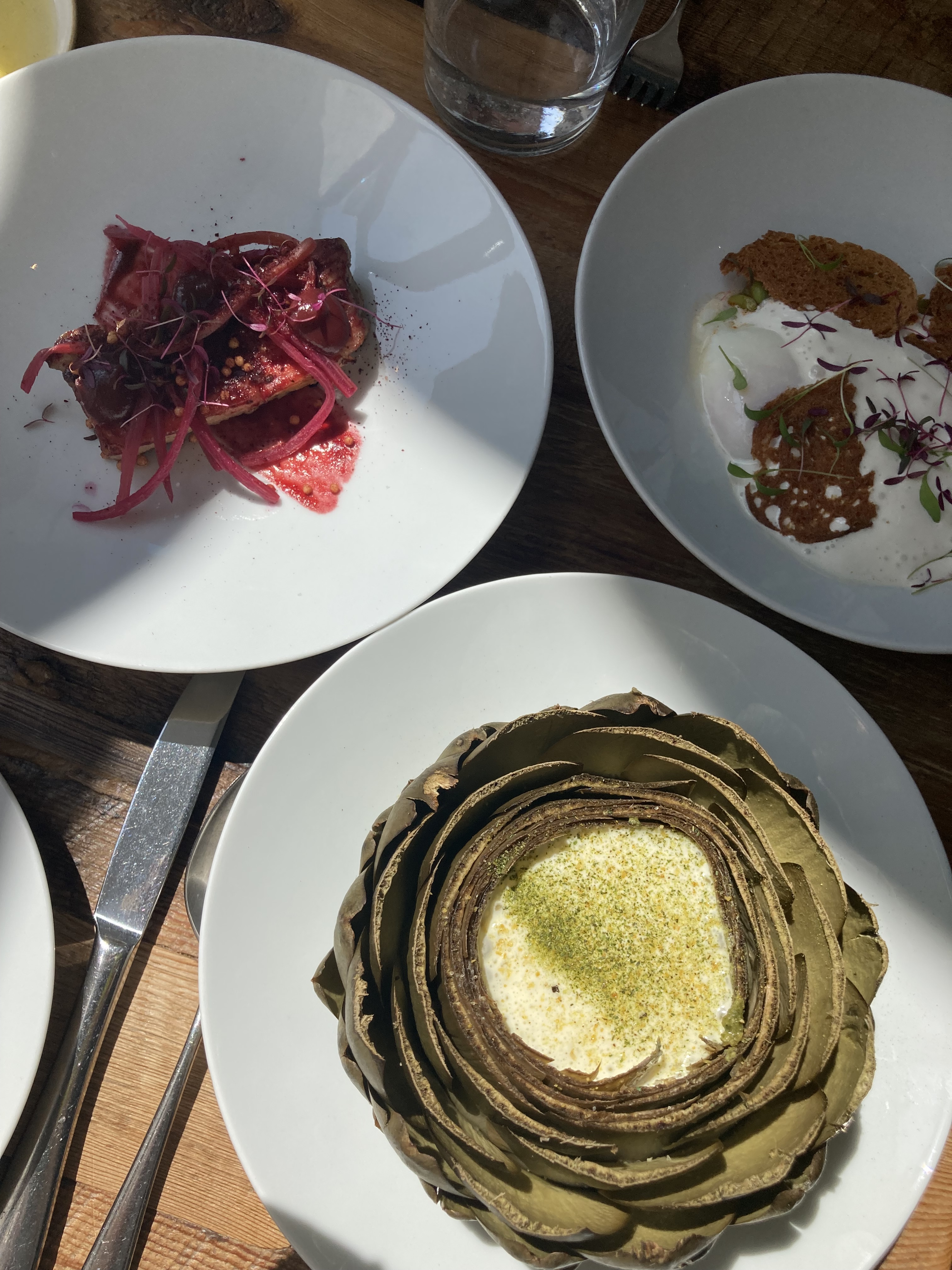 We had a reservation here for Saturday dinner, which we made well in advance. Amazing food, great interiors (the coolest chandelier and ceiling), a focus on sustainability. Everyone is required to get the tasting menu. I think there were nine courses, but they didn’t give us a menu before we began. You can add a drinks pairing, alcoholic or non-alcoholic. We chose the non-alcoholic and were served innovative concoctions to complement the dishes: white tea jasmine with a white asparagus infusion, a smoky non-alcoholic wine, a citrusy radish drink. Dishes were inventive and all vegan: white asparagus with flowers, nori roll with mole, a subtle mushroom-chocolate ice cream, a sorbet spiced with fennel seed. Higher end prices, but if you’re looking for a special meal (whether you’re vegan or not) I would highly recommend it.