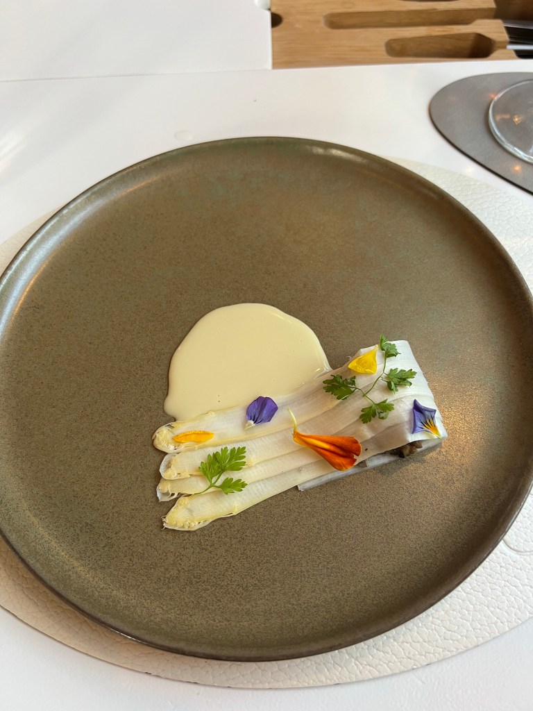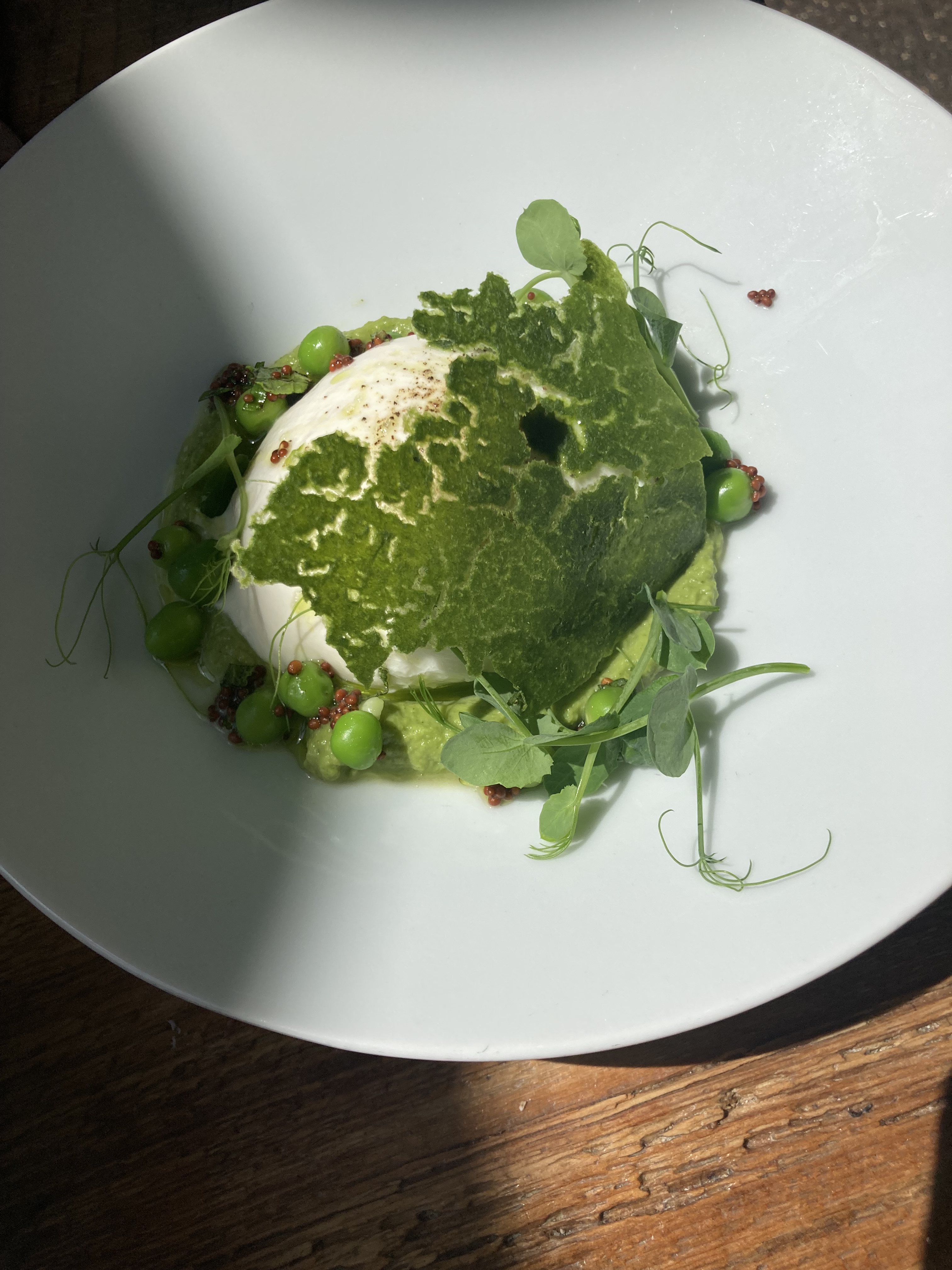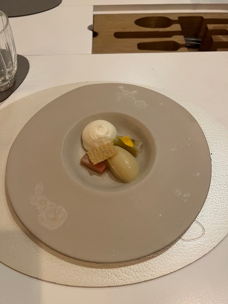 We had a reservation here for Saturday lunch. This was one of my favorite meals in Brussels. The interiors were modern, sharp (marble, stone, wood details) but relaxed. The wait staff were wearing t-shirts, but their service was upscale. They focus on farm to table, seasonal Belgian food. We were recommended to take the menu as sharing plates – we ordered 5 dishes for 2 people and it was the right amount for lunch. We had: burrata w/ pea puree, salmon with white asparagus & hollandaise, a poached egg in foam, pork with rhubarb and an artichoke with dipping sauce filling its middle. They had plenty of vegan options.